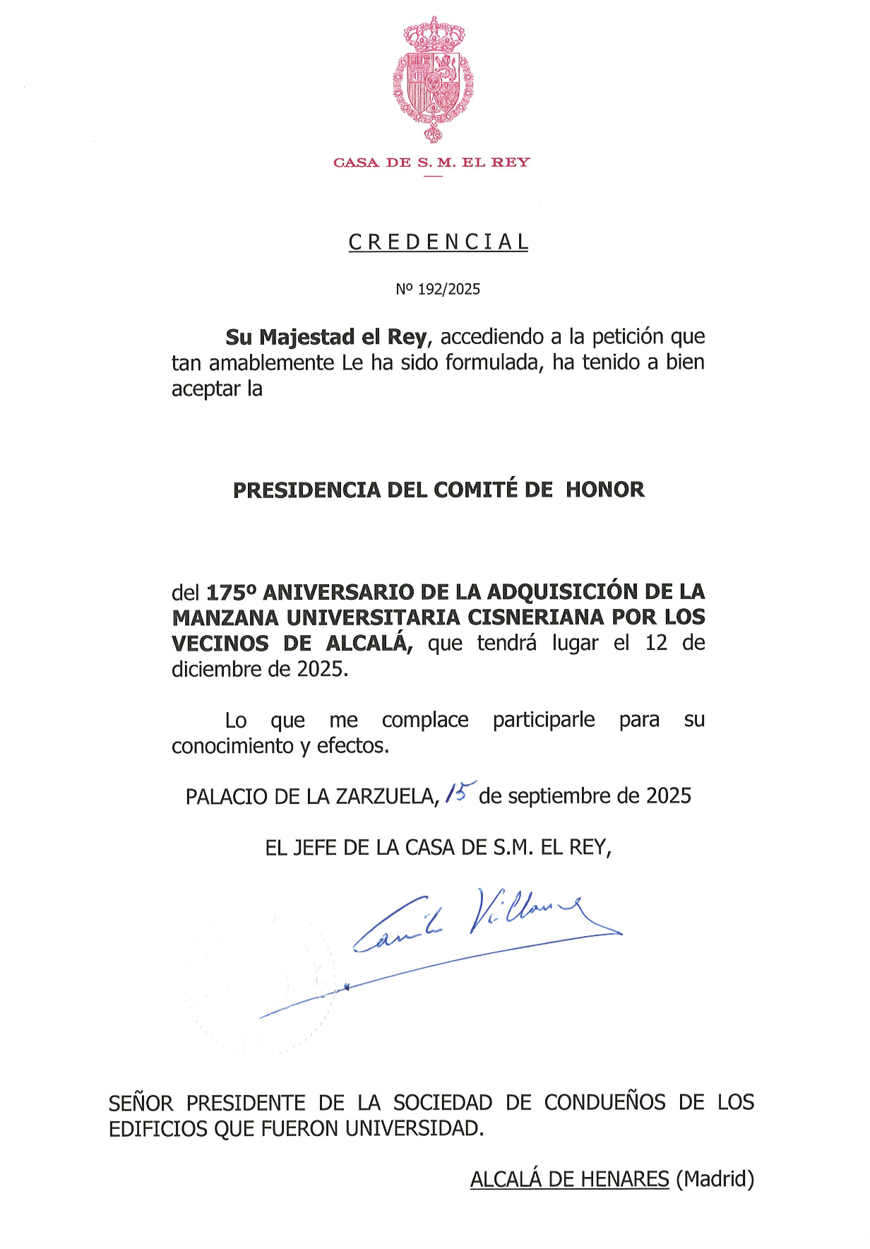 Aceptación de la Presidencia del Comité de Honor por parte de su Majestad el Rey