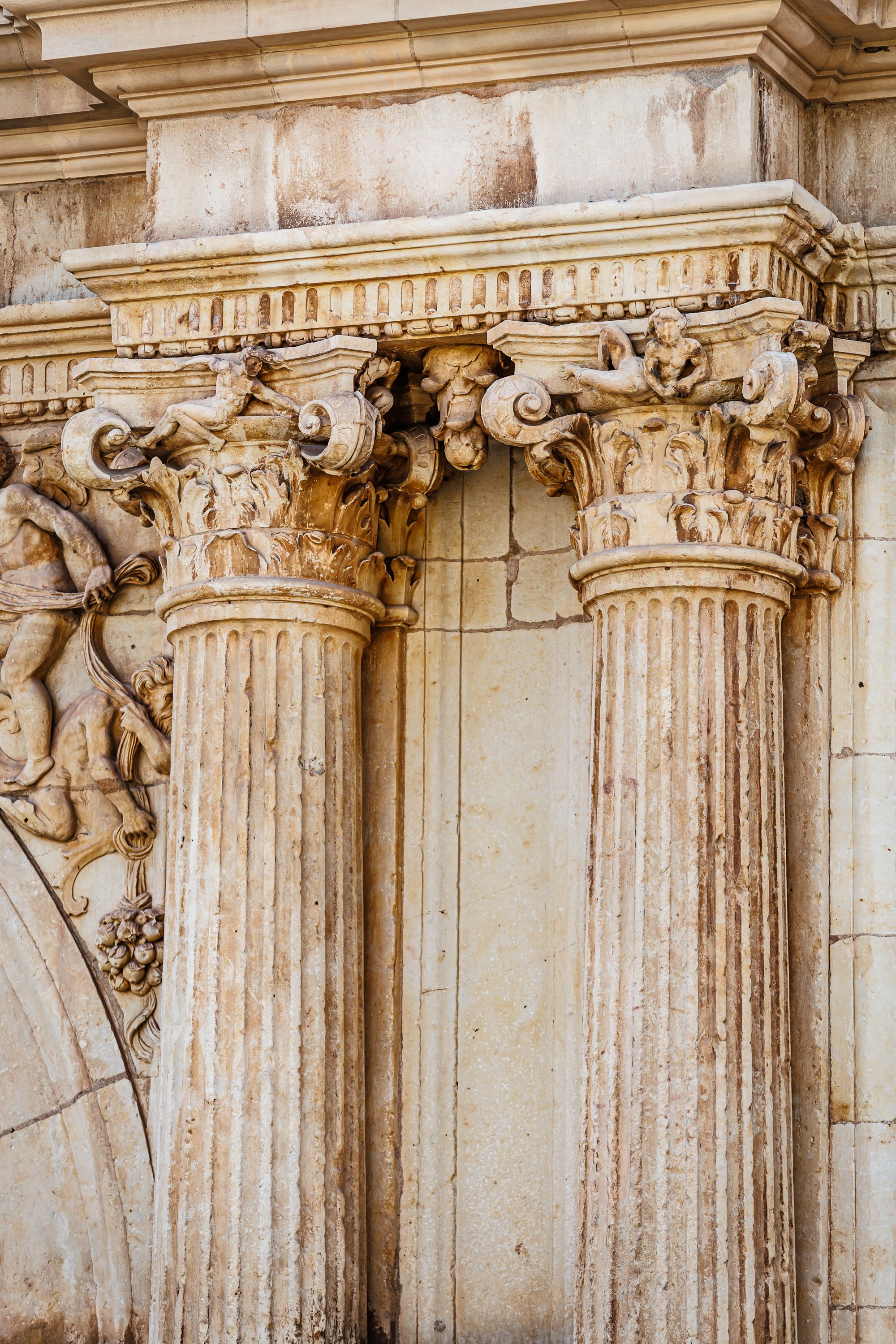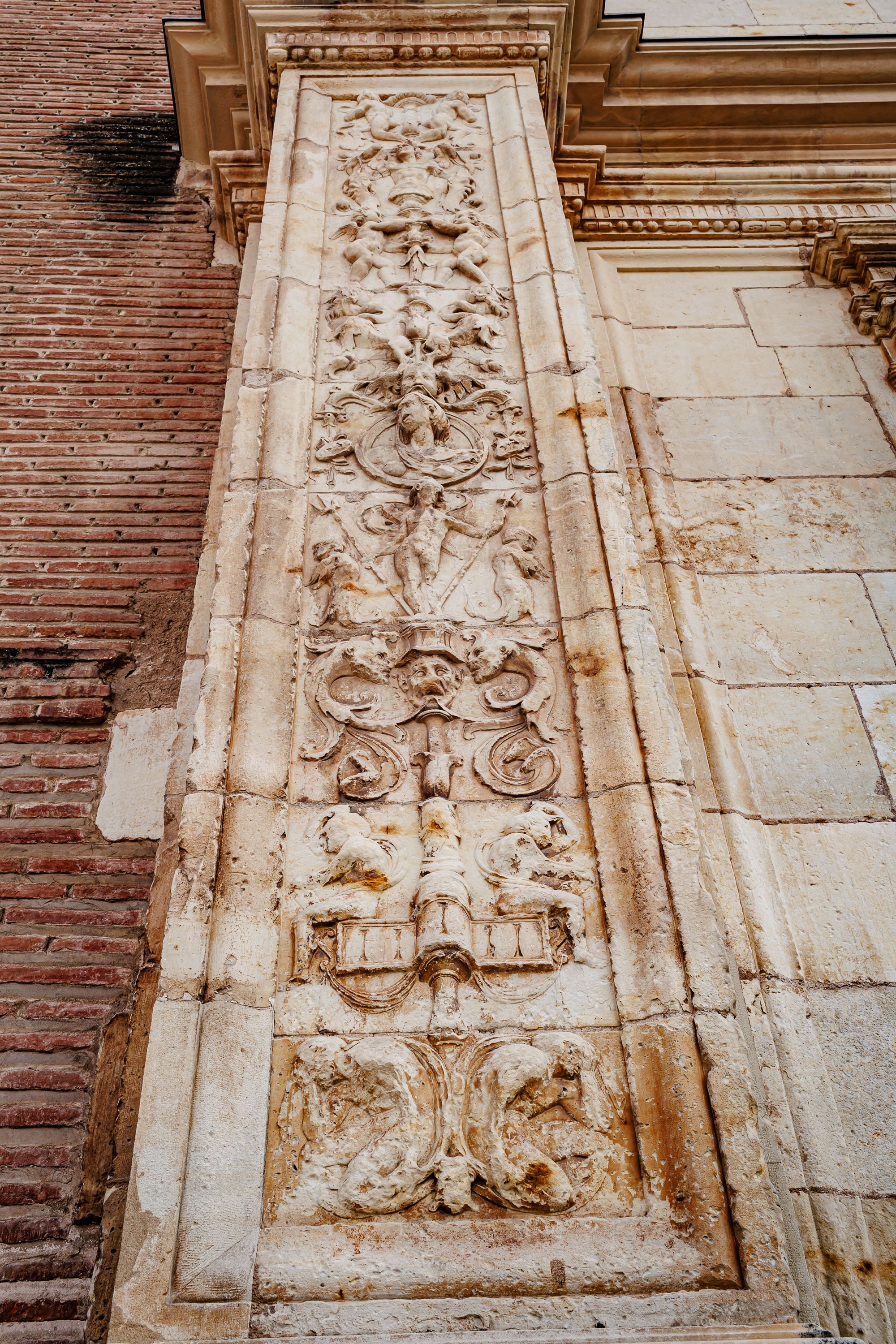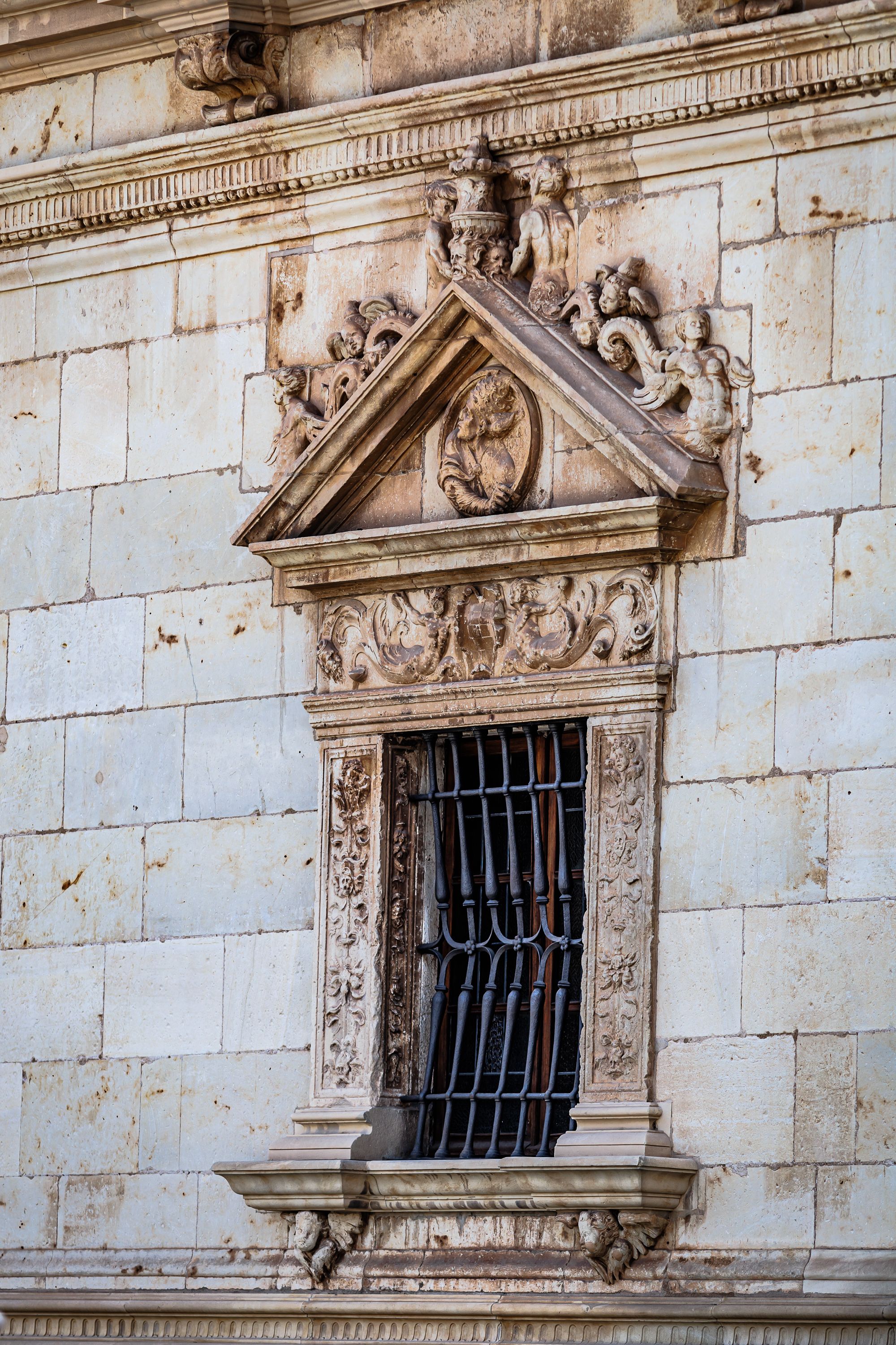 La fachada, es sin lugar a dudas, la más conocida y bella obra de Rodrigo Gil de Hontañón y fue iniciada en 1537, concluyéndose en 1553. Está realizada en piedra caliza de Tamajón. Algunos historiadores del arte la han calificado como "uno de los ejemplos más armónicos y proporcionados de la arquitectura española del siglo XVI". Está diseñada en forma de retablo de tres cuerpos desiguales en altura, con portada monumental y superposición de órdenes. Cada uno de los cuerpos de la fachada posee un programa iconográfico que corresponde a un estado del saber, con la teología como epicentro, representada por las representaciones escultóricas de los Padres de la Iglesia (San Agustín, San Jerónimo, San Ambroio y San Gregorio), colocadas dentro de cuatro medallones, obra del escultor Claudio de Arciniega, sobre cada una de las cuatro ventanas del primer nivel. Junto a estos medallones, las esculturas de atlantes, alabarderos, y una gran galería superior con ventanas, realizadas por el imaginero Claudio entre 1542 y 1548, aportan un característico aire clásico a la obra, si bien, esta no sigue cánones o reglas vitrubianas.