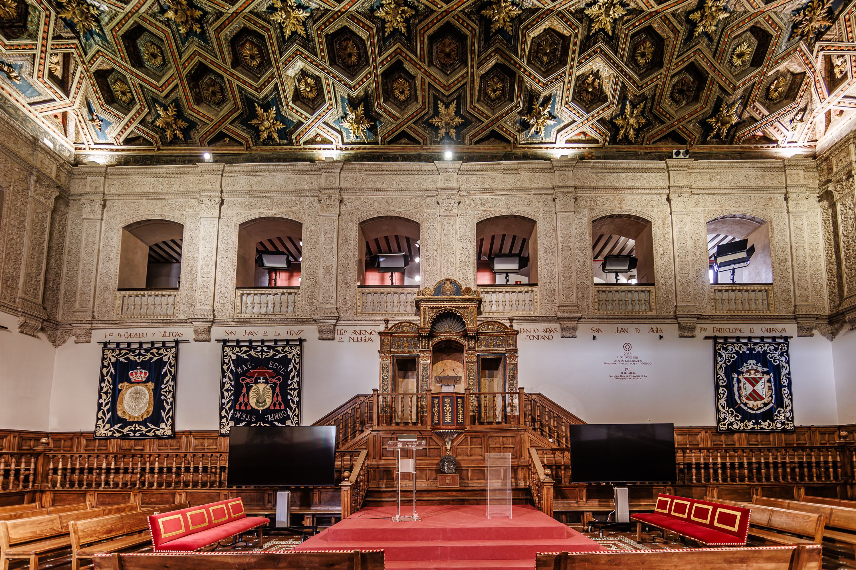 El paraninfo o teatro académico fue diseñado y construido por Pedro de la Cotera entre 1516 y 1520, siguiendo las indicaciones del Cardenal Cisneros, que no lo pudo ver finalizado, al fallecer en 1517. Las yeserías las trabajaron a cuchillo Gutiérrez de Cárdenas y Pedro de Villarroel, y la carpintería fue obra de Andrés de Zamora, Bartolomé Aguilar, Pedro Izquierdo y Hernando de Sahagún. En este espacio se celebraron importantes actos académicos de la Universidad de Alcalá entre los siglos XVI y XIX (inauguraciones y clausuras de los cursos, graduaciones, dictámenes jurídicos, lecciones magistrales, y tomas de posesión de "maestros" en artes, cánones, filosofía, medicina, teología, gramática latina o griega) y otras actividades de gran relevancia política y cultural.