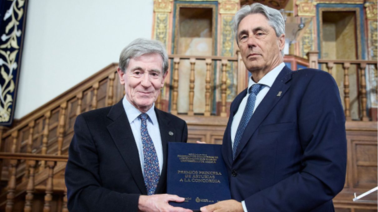 El rector de la Universidad de Alcalá, José Vicente Saz, ha hecho entrega al presidente de la Sociedad de Condueños, José Félix Huerta, de un ejemplar encuadernado del informe presentado ante la Fundación Princesa de Asturias proponiendo su candidatura a los premios que esta convoca cada año.
