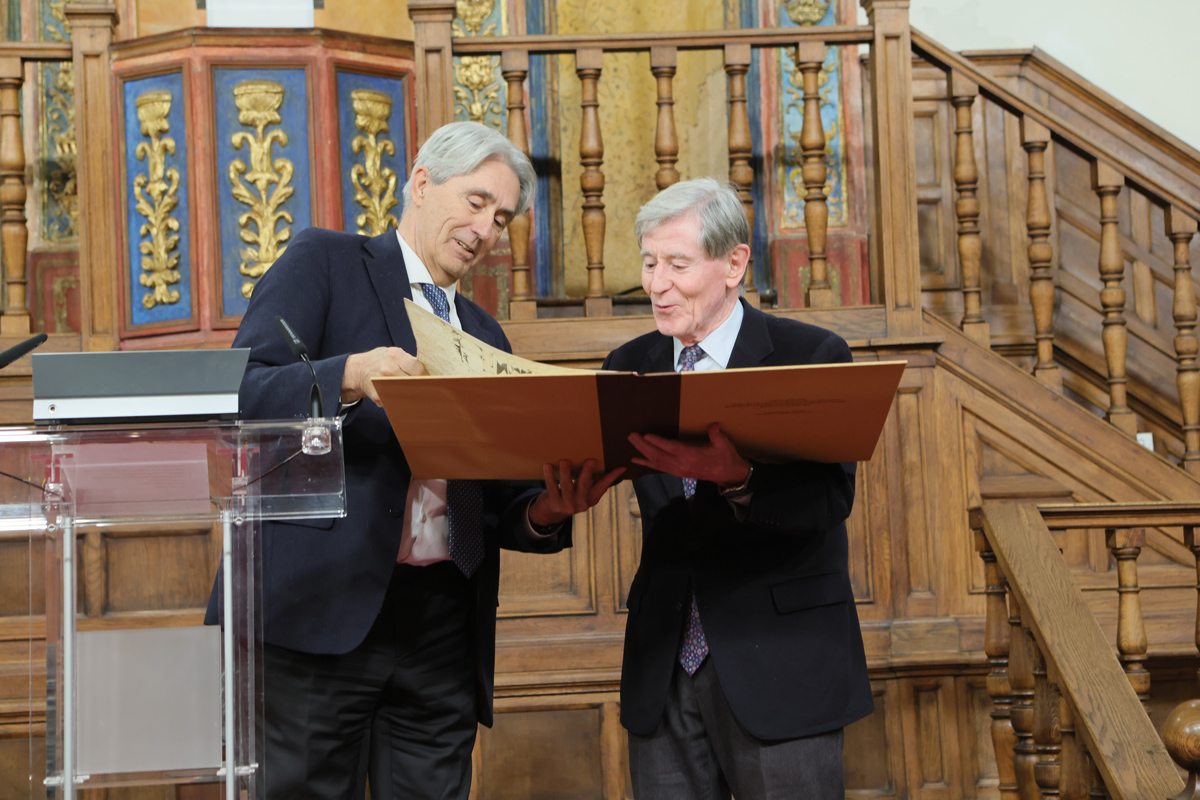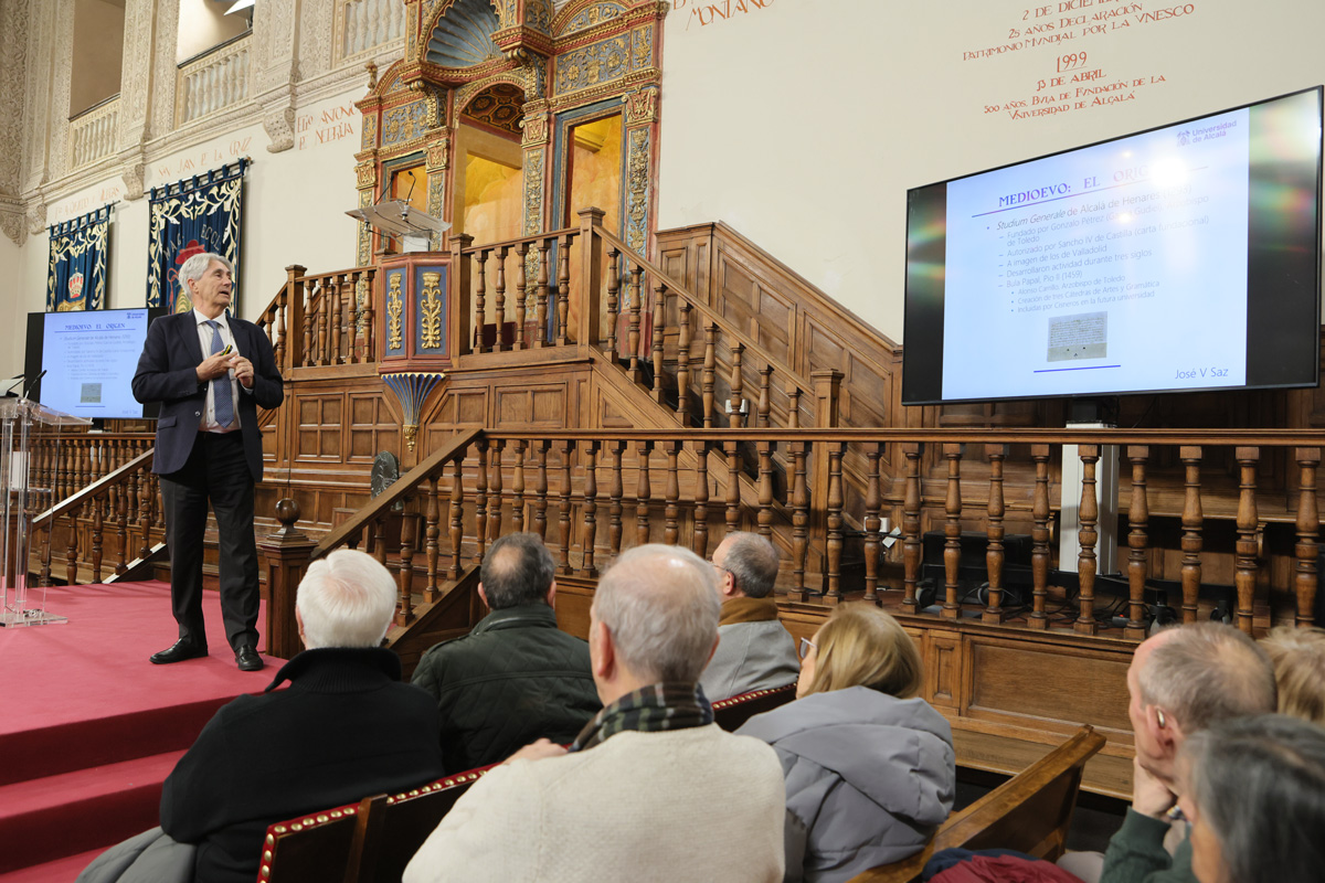 El Paraninfo acogió este jueves una conferencia del rector de la UAH en el marco de los actos conmemorativos de la creación de la entidad ciudadana que garantizó la conservación del legado de la Universidad de Alcalá. La ocasión sirvió también para que el presidente de la Sociedad, José Félix Huerta, recibiera un exclusivo ejemplar de la Carta Bulada que autorizó la creación de la institución en 1499
