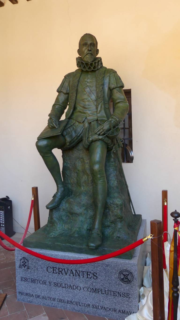 La nueva escultura ubicada en el patio de la Antigua Hospedería de la Universidad, que da acceso a la sala histórica de la Sociedad de Condueños, y representa al escritor alcalaíno que, a pesar de estar sentado, tiene un notable tamaño, pues supera los dos metros de altura (2,20 metros). Se trata de una donación del Círculo Hispanista Complutense a la Sociedad de Condueños, con la colaboración del teniente general Muro.