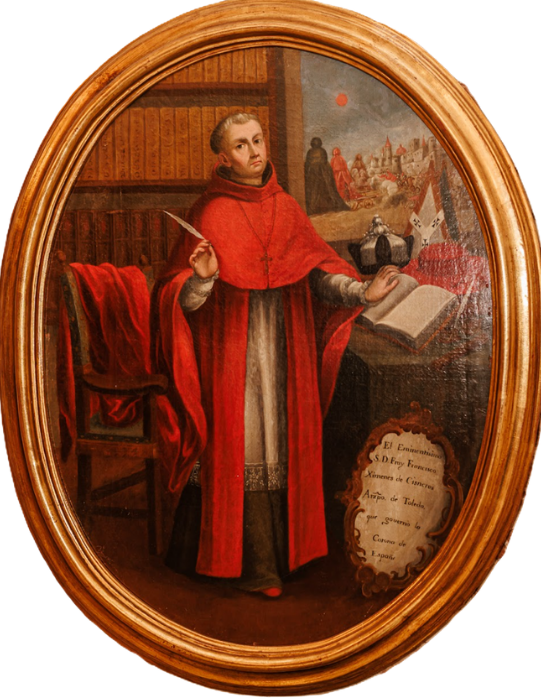 Original retrato comprado en Méjico, hace unos años, de la primera mitad del Siglo XVIII. Representa al fundador de la Universidad de Alcalá con los atributos conocidos del personaje, birrete de doctor, capelo cardenalicio, escena de la batalla de Orán. Además, hay una cartela que describe al Arzobispo, pero físicamente no tiene nada que ver con el rostro que conocemos de Cisneros a través de la obra de Felipe Bigarny.