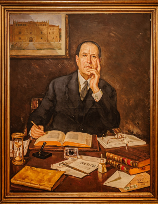 Que fue presidente de la Sociedad de Condueños, alcalde de Alcalá y Magistrado del Tribunal Supremo. El autor del óleo es Eduardo Chicarro, gran retratista y miembro de la Academia de San Fernando. Aparece el protagonista como persona amante de los libros, la escritura, la cultura francesa y Alcalá de Henares.