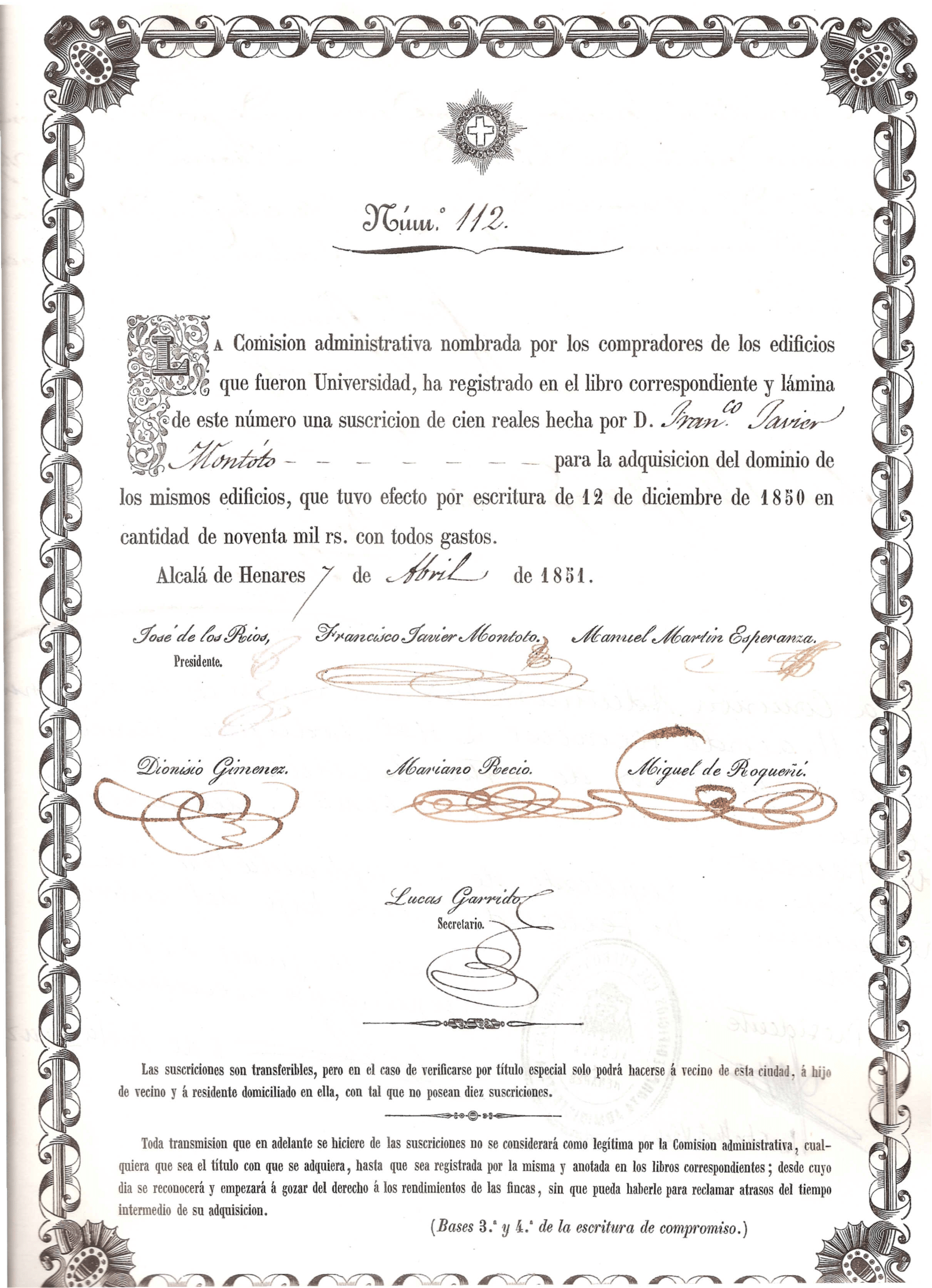 Esos edificios se adquirieron en 1850, por un importe de 90.000 reales, en 900 láminas de 100 reales, que solo podían transferirse entre vecinos de la ciudad, y de las que una persona no podía tener más de diez. Inicialmente hubo 204 condueños. Con los años, hay 461 láminas sin actualizar, y los titulares de las restantes láminas son los actuales condueños, herederos de anteriores titulares o personas e instituciones comprometidas con la cultura complutense.